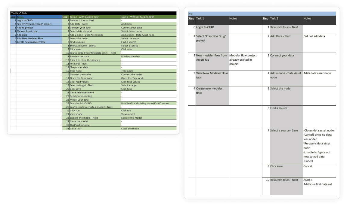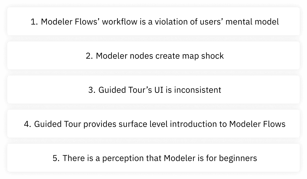 I placed the issues within the tour in an issue severity matrix and created 5 themes to help communicate the findings and tell a compelling story. I learned that the workflow was a violation of user's mental model and modeler created map shock. The guided tour's UI was inconsistent and only provided a surface level introduction to Modeler Flow. Finally, new users perceived Modeler to be for beginners, when it is really intended for users of all skill levels.