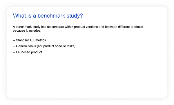 After conducting brainstorming sessions with Design and PM, I led an official Research Kick-Off presentation that outlined the reasoning behind a benchmark study, the research plan, outstanding questions, and next steps.