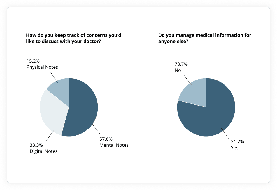 We learned that both individuals and caregivers struggle to stay organized when it comes to their healthcare. Doctors, prescriptions and insurance tend to change, and it is often hard to keep track of this information. When visiting the doctor, people rely on their memory to communicate their symptoms. For those responsible for the health information of others, it is even more of a struggle to keep information organized.