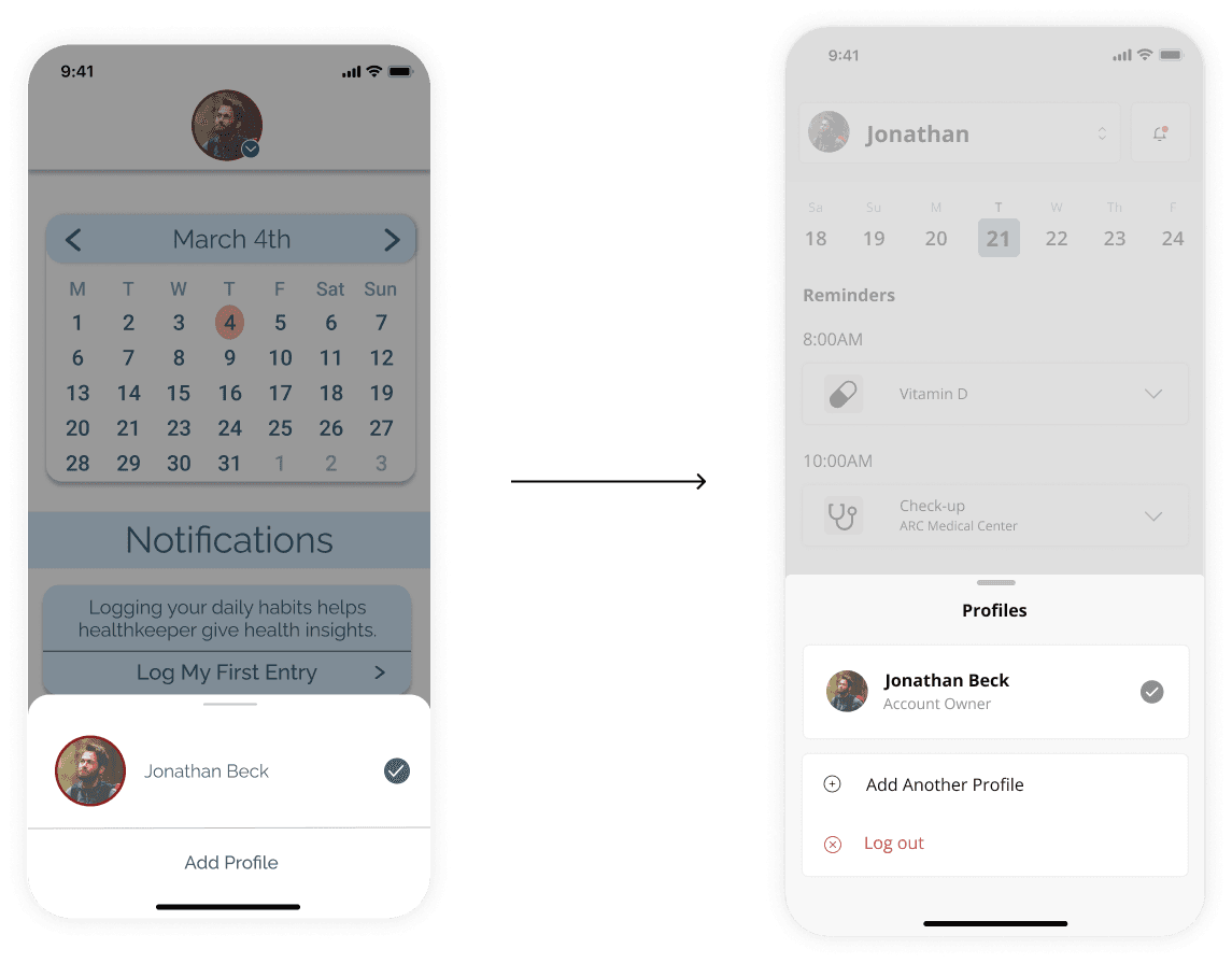 I modernized the design for switching between profiles - which is key feature of the app. I included the ability to log out, which was not previously included.