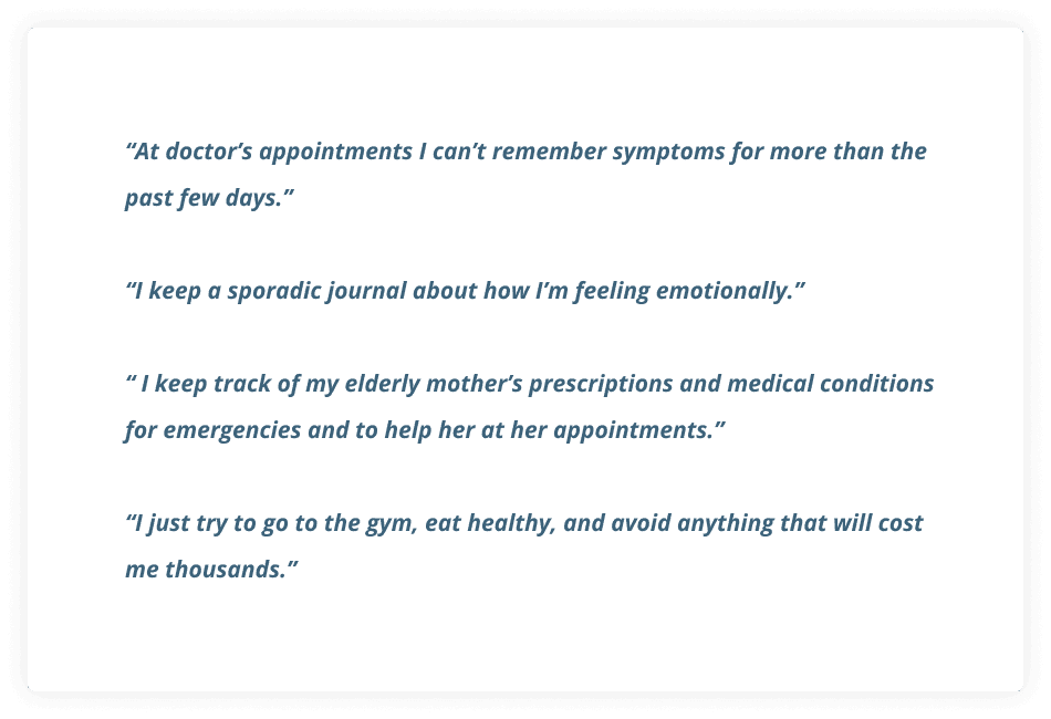 Adults need a better way to store their health history, track ongoing symptoms and document their concerns in order to better understand and address their health needs and the health needs of others.