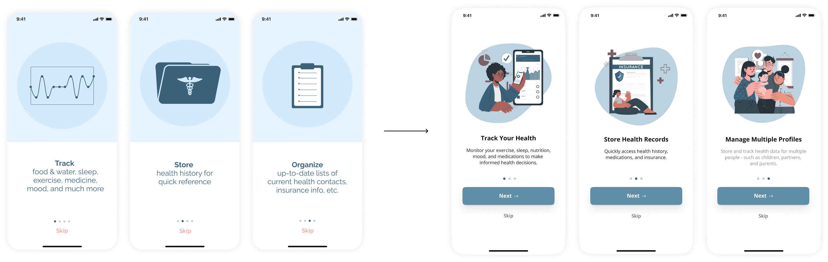 This iteration and prototypes allows users to track their medicine, sleep, exercise, prescriptions, food & water. We hope that future iterations allow users to track even more! Users can also store their current health information (ex. doctors, insurance, and prescriptions) as well as their family’s health history.