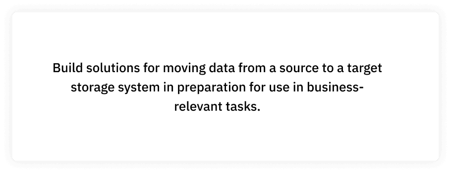 The Ingestion squad conducted 9 interviews with people who identified skills that reflected our hypothesized main job of building solutions to move data from a source to a target storage system in preparation for business-relevant tasks. We met with data engineers in addition to system engineers, data scientists, senior data analysts, and a head of technical architecture and IT operations.