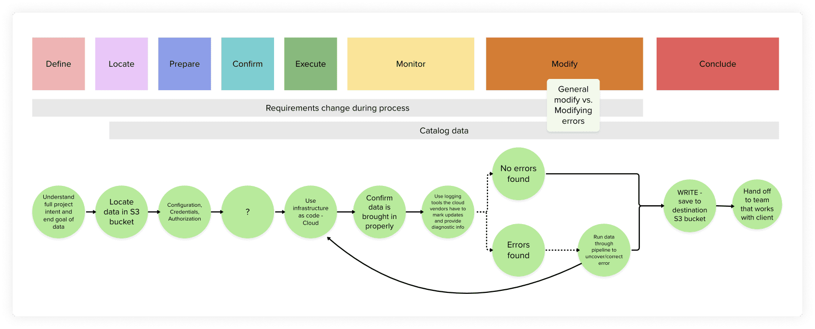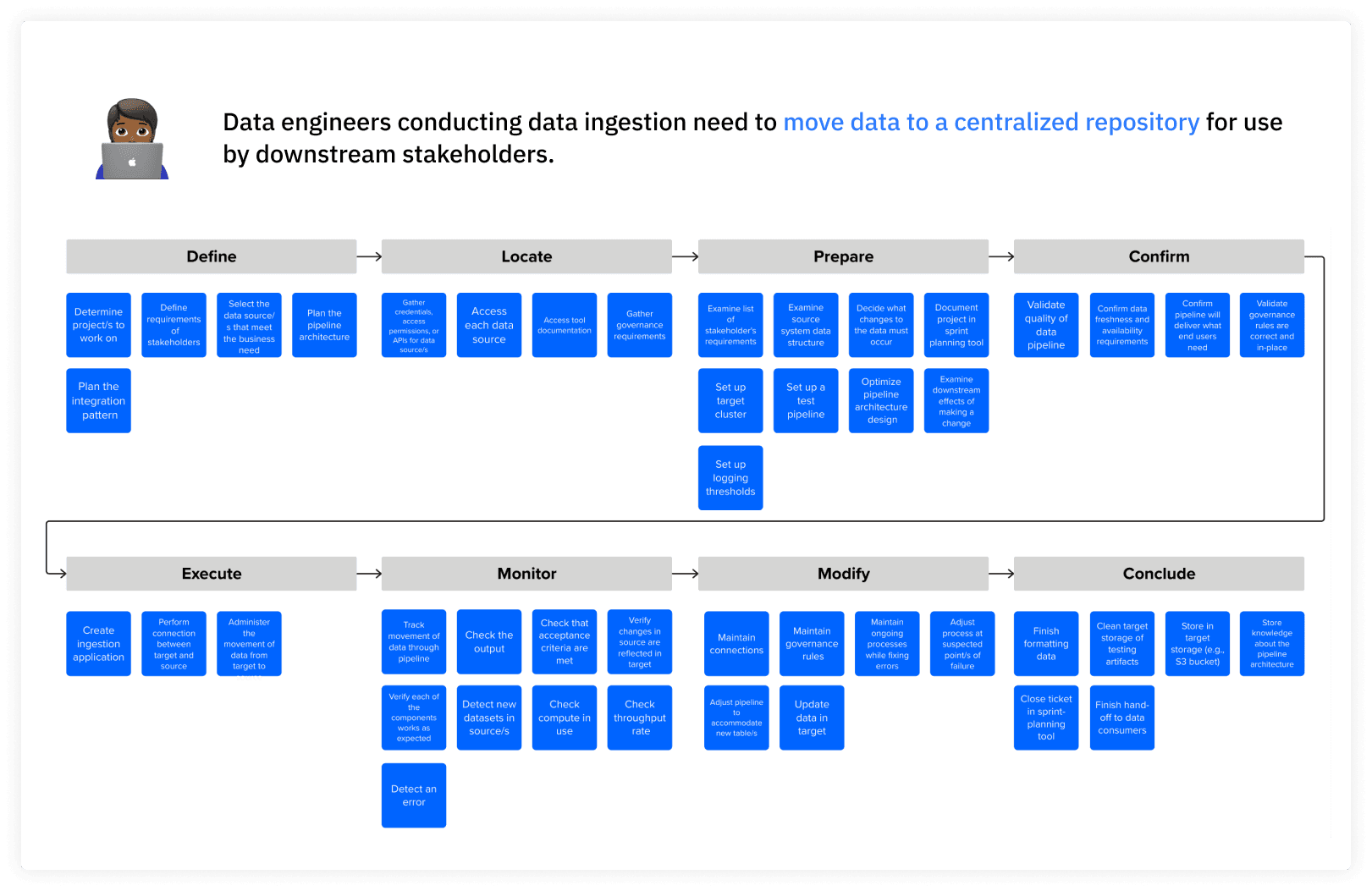 Job map for data engineers doing data ingestion that placed their job steps into one of eight phases: define, locate, prepare, confirm, execute, monitor, modify, and conclude.