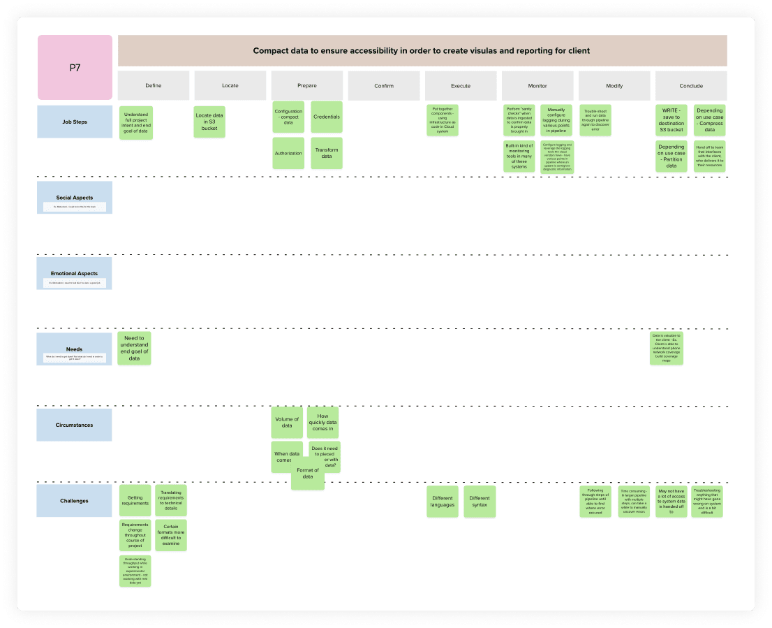 Synthesis of the interviews followed the steps outlined by Anthony W. Ulwick. We outlined the job steps, social aspects, emotional aspects, needs, and the circumstance of data engineers focused on data ingestion.